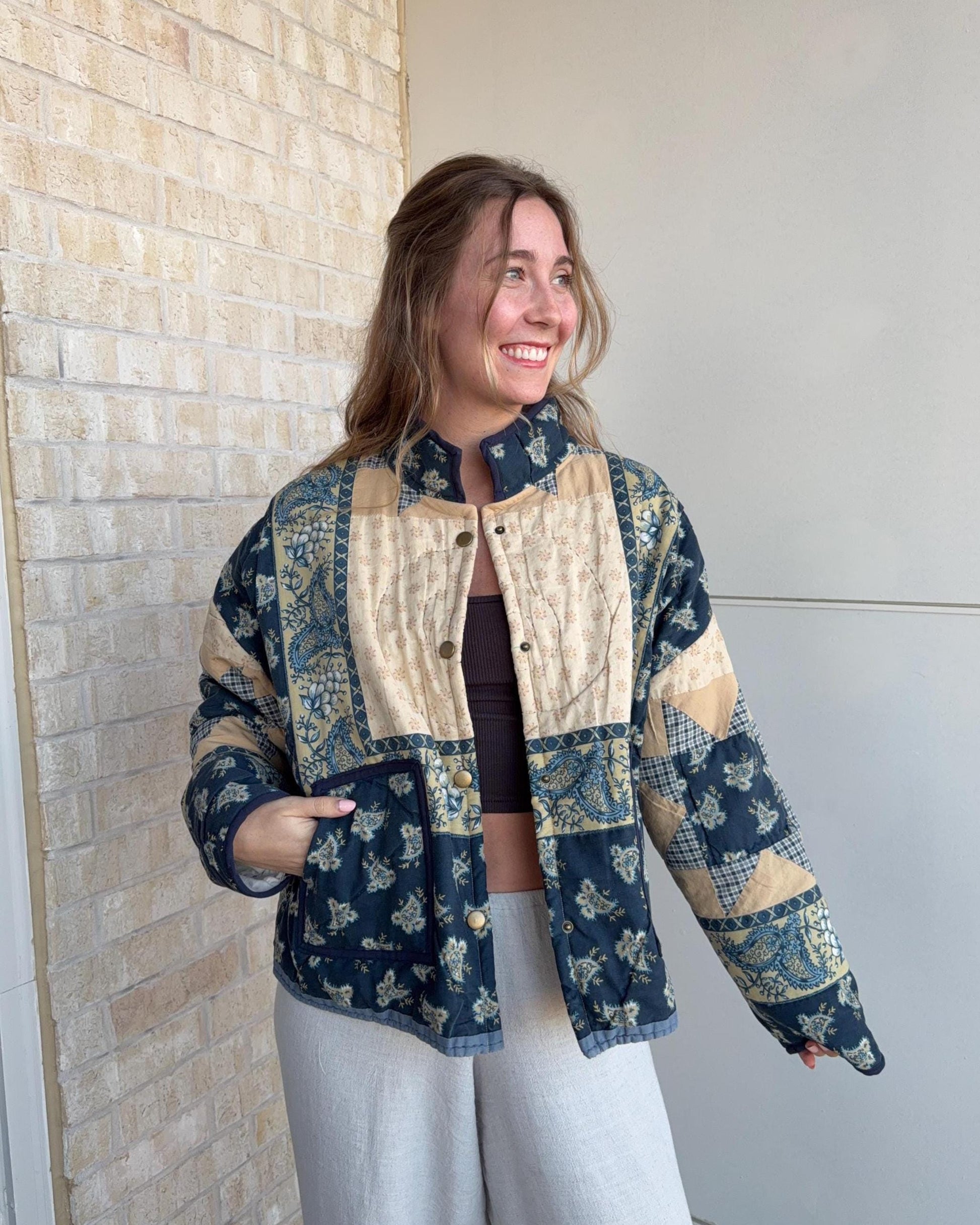 This one-of-a-kind quilted jacket is made from a thoughtfully upcycled, hand-stitched quilt, giving it an ultra-soft, cozy feel with beautiful texture and character.